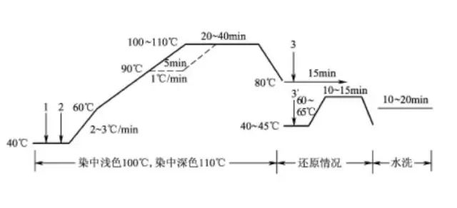 預定形( 視織物規(guī)格而定)→ 前處理→染色→還原清洗→烘干→后定形→整理